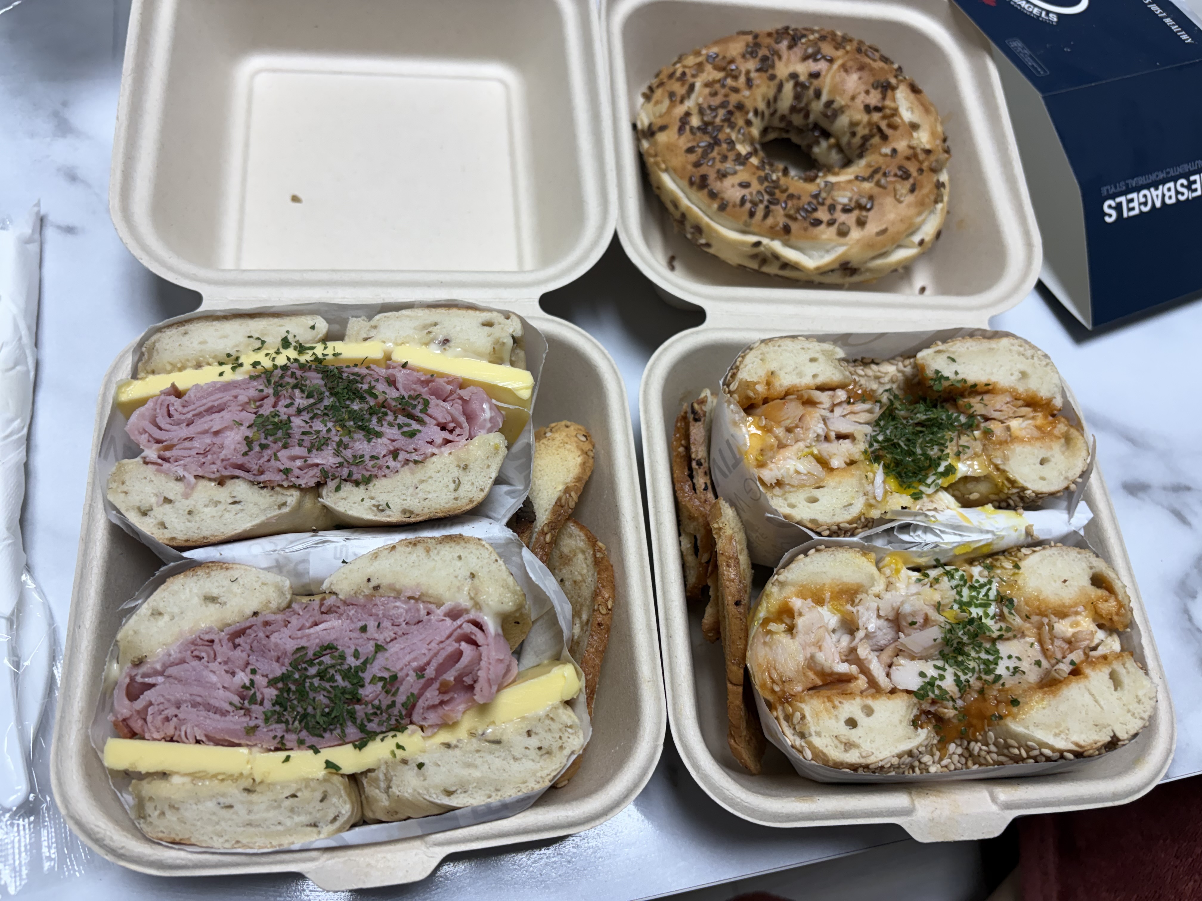 배달앱에서 리뷰가 많은 에그멜트 베이글과 잠봉뵈르 베이글을 시켜봤어요. 배고팠는데 다행히 빨리 오더라고요.😍