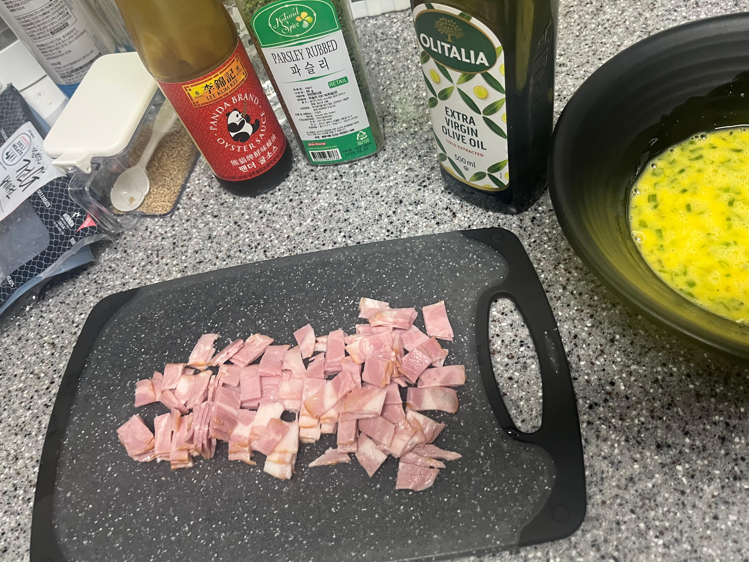 - 굴소스 , 베이컨 4줄 , 쪽파, 계란2개 , 식용유 , 야채모듬 ,밥 (2인분)